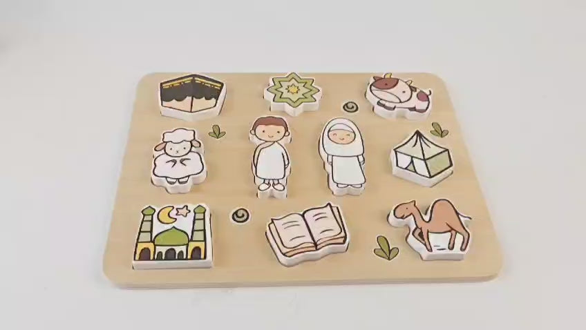 A beautiful wooden matching board featuring Islamic objects like the crescent moon, prayer rug, masjid, and more! Children match the picture tiles to strengthen vocabulary, memory, and recognition skills—Montessori style.
